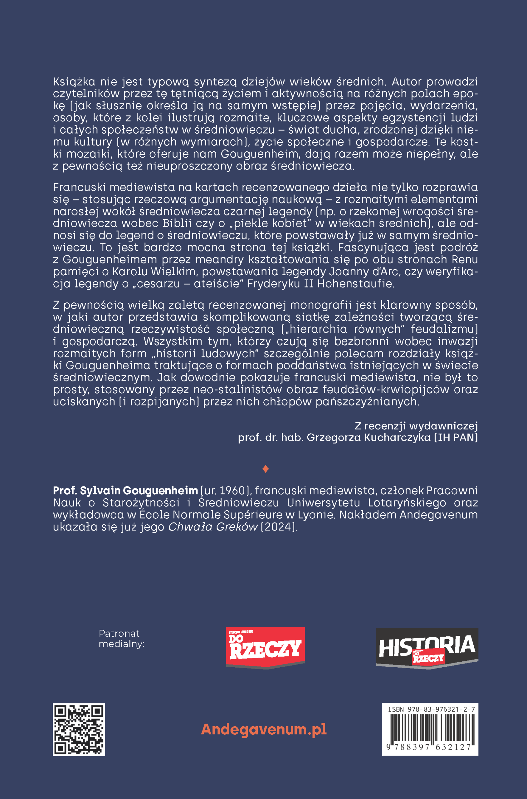 Prof. Sylvain Gouguenheim (ur. 1960), francuski mediewista, członek Pracowni Nauk o Starożytności i Średniowieczu Uniwersytetu Lotaryńskiego oraz wykładowca w École Normale Supérieure w Lyonie. Nakładem Andegavenum ukazała się już jego Chwała Greków (2024).